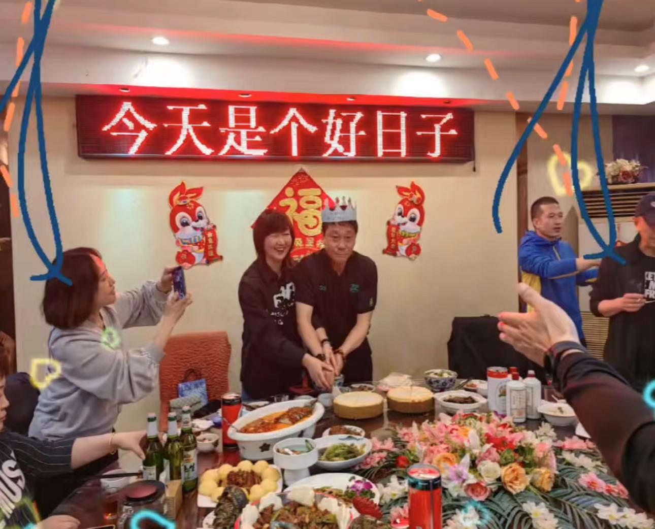 曝光的画面中,高峰点了不少好酒好菜。戴着生日王冠的他,还和老婆范春玲手握手一起切生日蛋糕。范春玲脸上笑得特别开心,幸福之情溢于言。