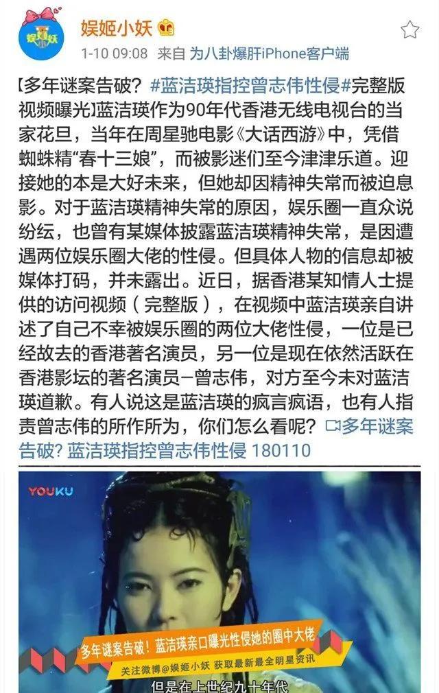 蓝洁瑛在接受香港八卦周刊记者采访时,亲口说自己曾经遭到2名影坛大佬强奸,并爆了这两位大佬的名字,