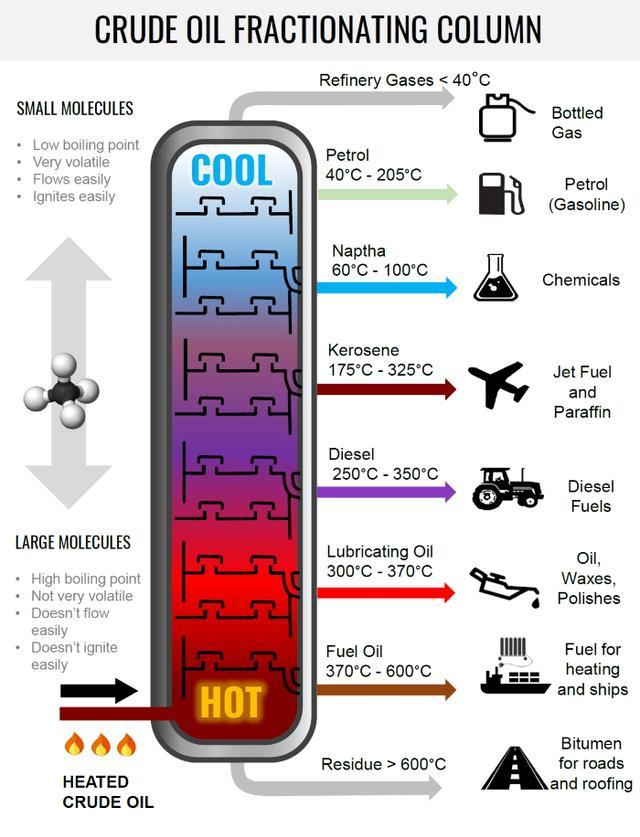 由于原油是许多不同的碳氢化合物物质的混合物,它们可以相互混溶,因此在原油变成煤油之前,必须将其分离成各种组分
