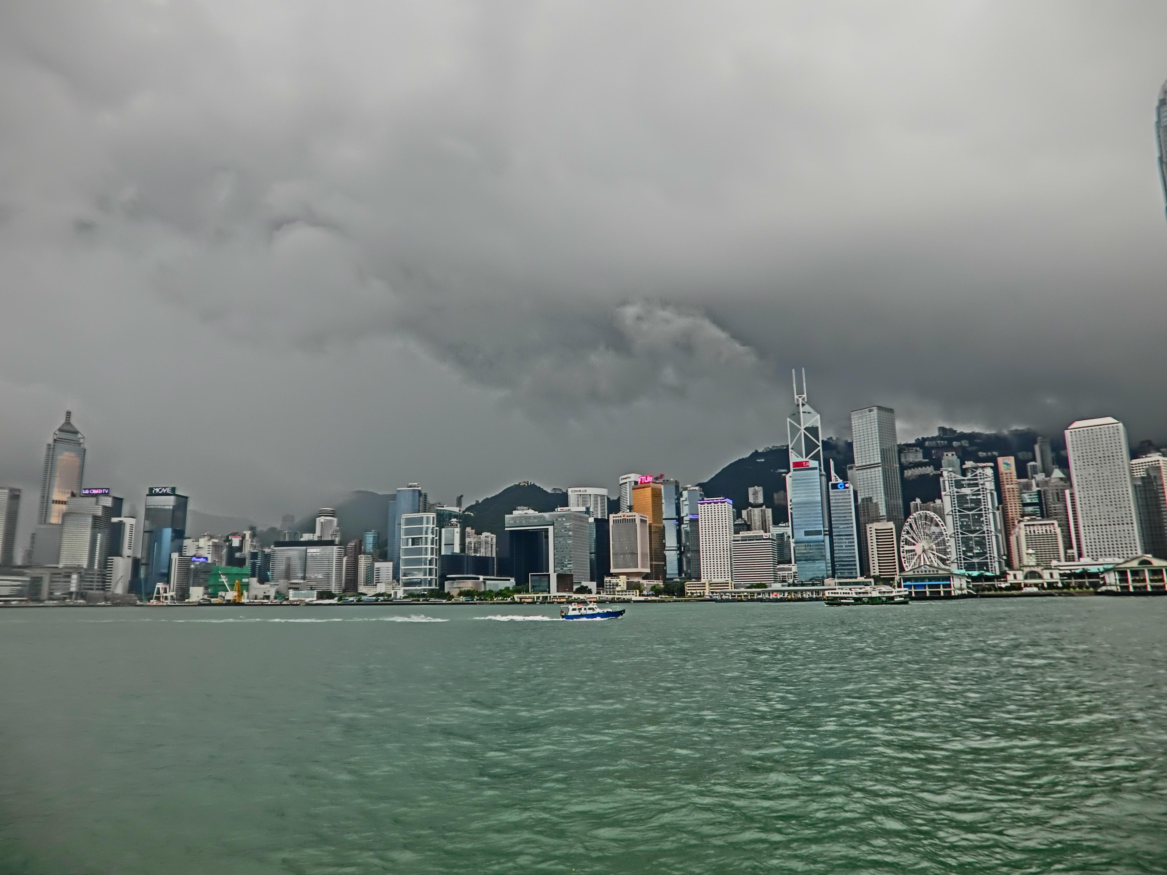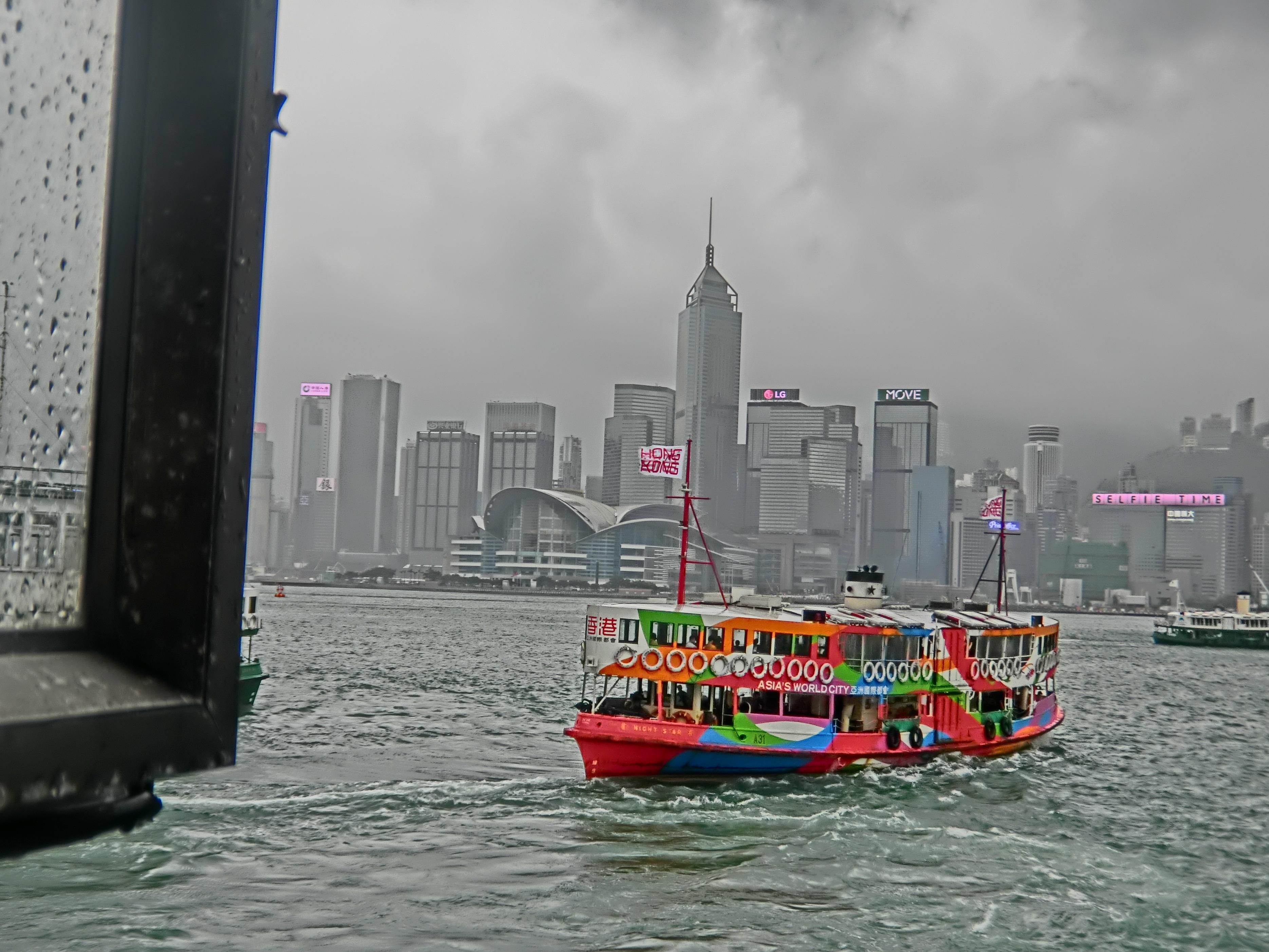 当时我去的时候好巧不巧赶上了阴雨天,风景没那么美丽但依旧兴奋,大白天来维多利亚港主要是为了体验一把这儿的轮渡——2块钱/人的天星小轮,比武汉10块钱/人的普通轮渡的体验感好很多。